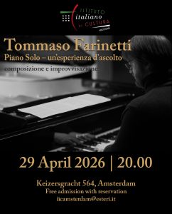 L’Istituto Italiano di Cultura presenta il compositore e pianista Tommaso Farinetti Piano Solo – un’esperienza d’ascolto composizione e improvvisazione Martedì 29 aprile 2026, ore 20.00 Keizersgracht 564, Amsterdam Tommaso Farinetti propone un recital per pianoforte solo che si muove tra neo-classical e modern classical, in cui scrittura originale e improvvisazione si intrecciano in un unico, […]